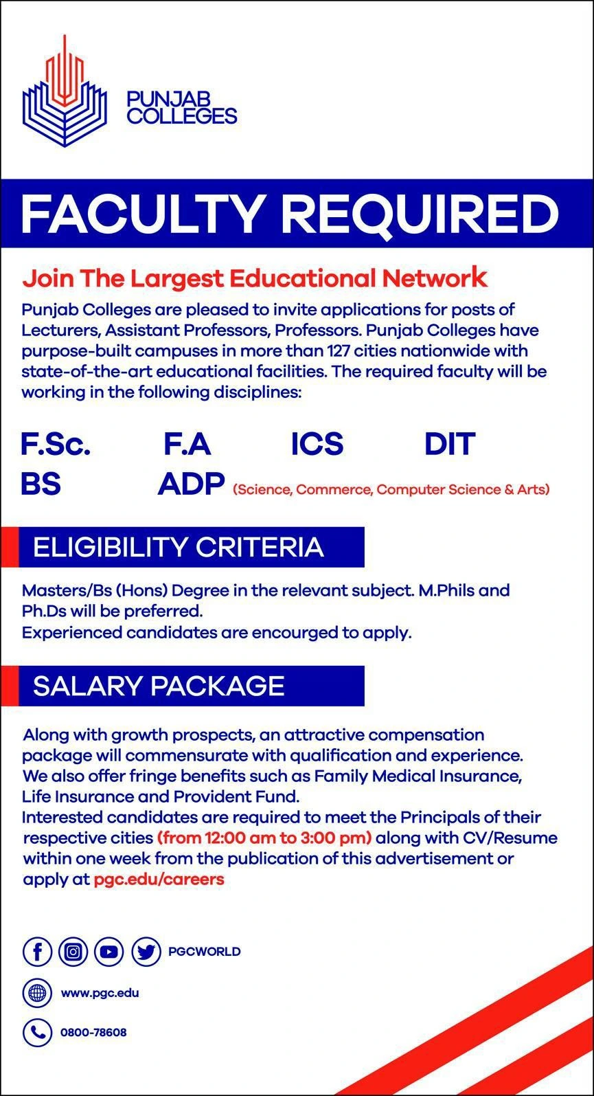 Punjab Colleges has built a strong reputation with campuses in over 127 cities across Pakistan. With state-of-the-art facilities and a commitment to quality education, the institution aims to hire highly qualified faculty members who can contribute to academic success.