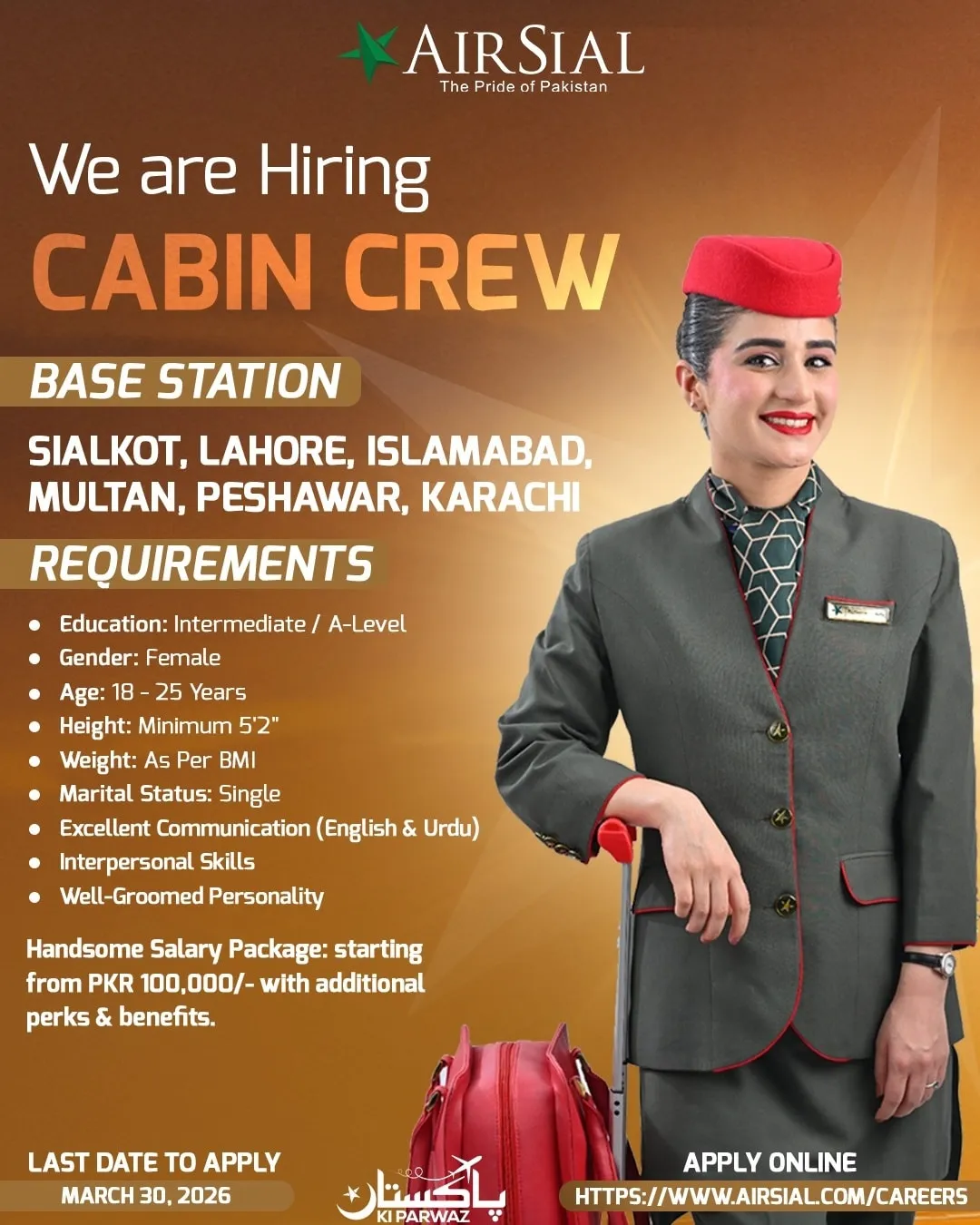 AirSial has launched Cabin Crew Jobs 2026 for females in Pakistan, offering young women an exciting entry into the aviation industry with professional training and international travel exposure. The low-cost carrier seeks energetic, well-groomed candidates for AirSial cabin crew vacancies across major bases including Sialkot, Lahore, Islamabad, Multan, Peshawar, and Karachi. With AirSial jobs salary starting PKR 100,000 monthly plus flight allowances, medical benefits, and discounted travel, this represents one of Pakistan’s most attractive airline cabin crew jobs 2026.