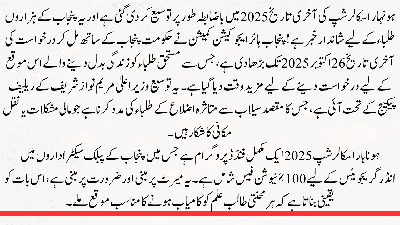 - ہونہار اسکالرشپ کی نئی آخری تاریخ 2025 کیا ہے؟