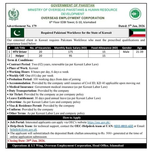 Overseas Employment Corporation (OEC) is recruiting Pakistani workforce for Kuwait under a two-year renewable contract as per Kuwait Labor Law. The recruitment includes driving and helper positions with fixed monthly salaries, food allowance, accommodation, and other benefits clearly mentioned in the advertisement.