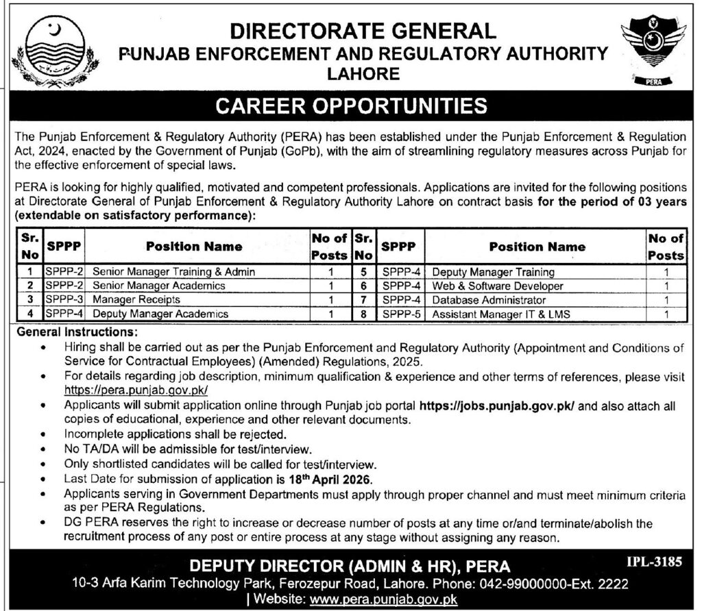 The Punjab Enforcement and Regulatory Authority (PERA) has officially announced PERA Jobs 2026 under the Government of Punjab. These latest government vacancies offer an excellent career opportunity for individuals seeking stable and well-paying jobs in Punjab.
