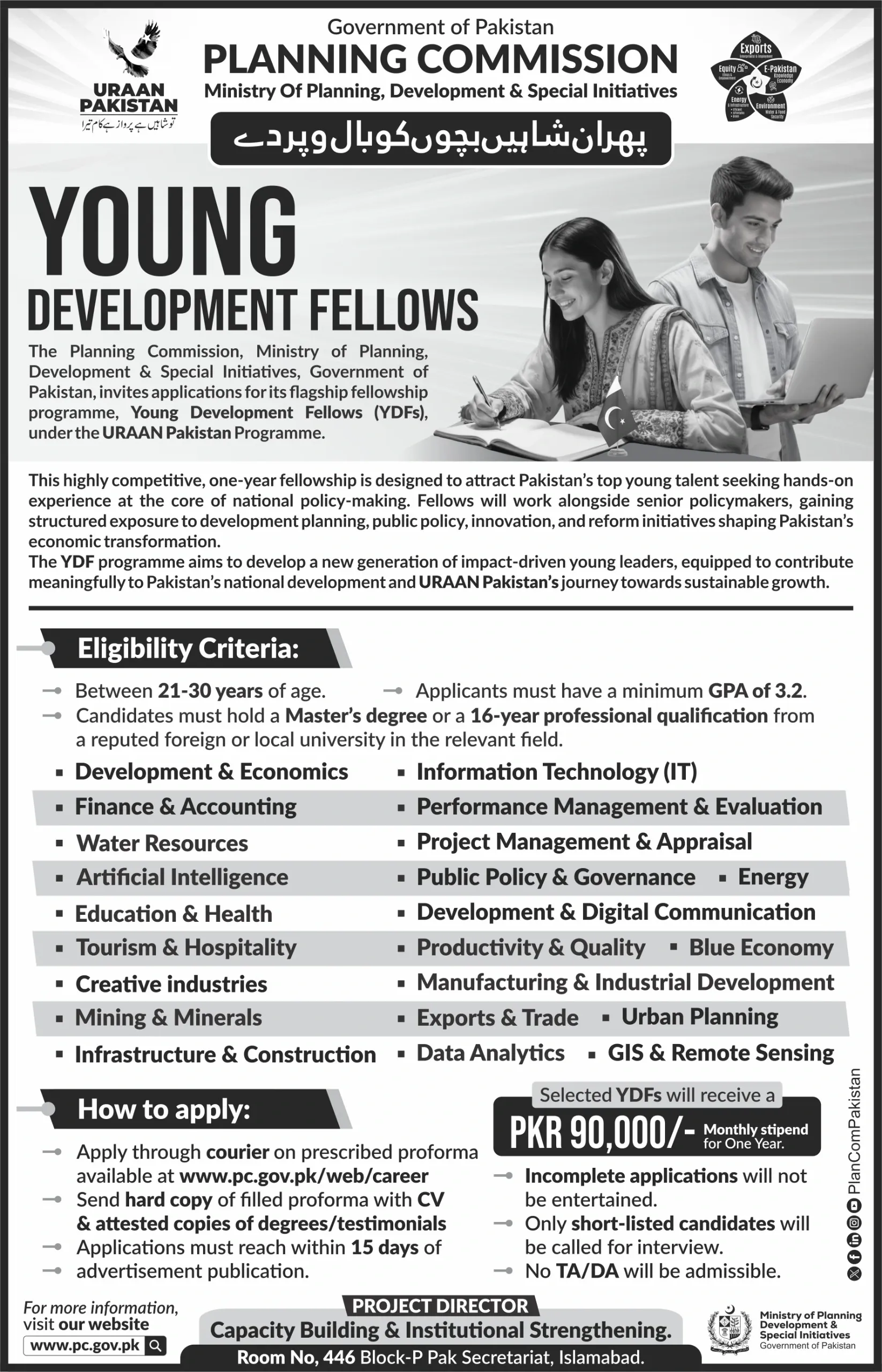 Planning Commission Pakistan, Ministry of Planning, Development & Special Initiatives, Government of Pakistan, has announced applications for its flagship fellowship programme Young Development Fellows (YDFs) under the URAAN Pakistan Programme. Applications are invited strictly according to the information provided in the official advertisement.Pakistan job updates