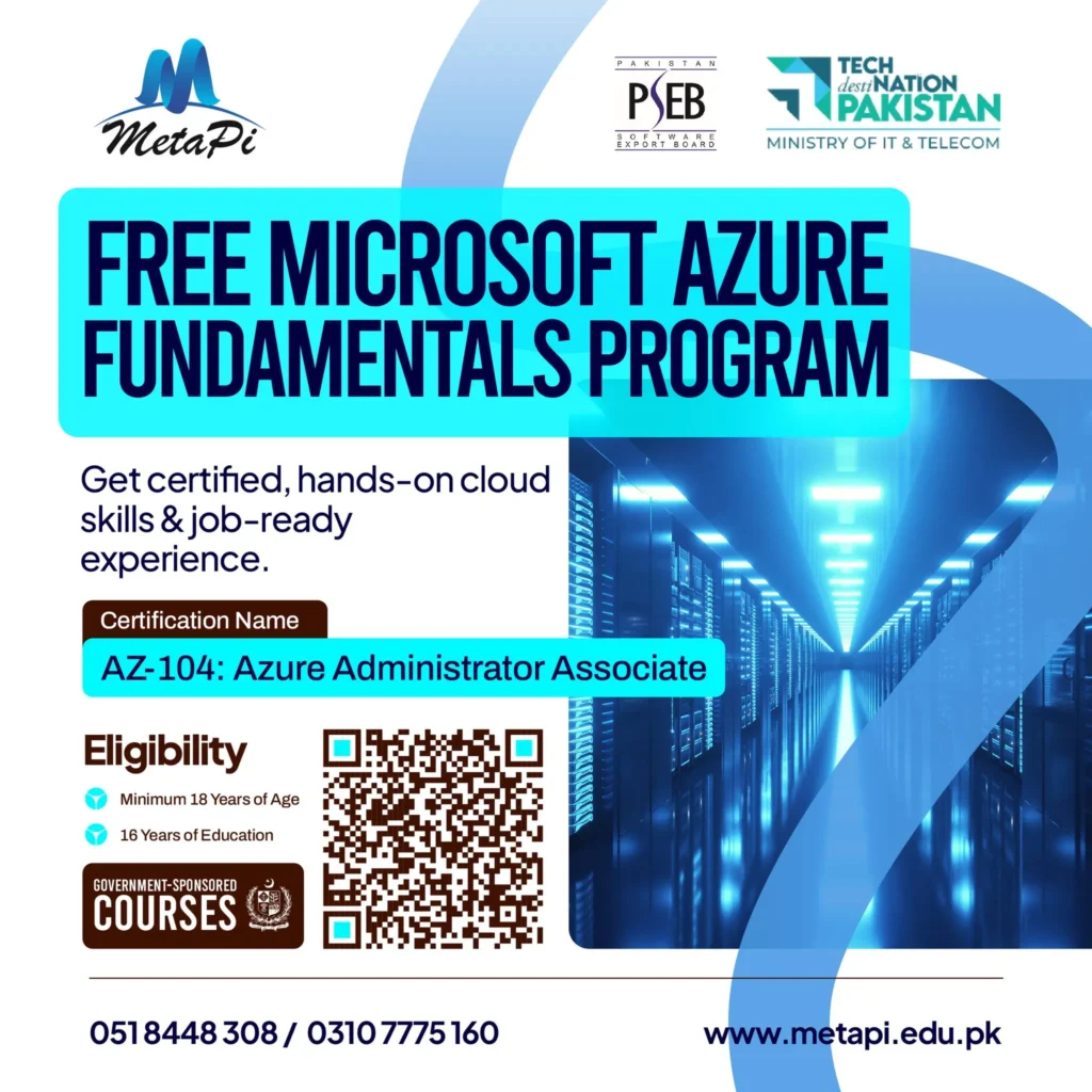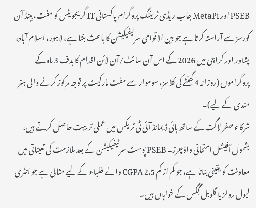 A free 3-month IT training initiative by Pakistan Software Export Board (PSEB) and MetaPi Technologies for IT graduates, offering hands-on skills and international certifications like Microsoft Azure Data Scientist and Python PCAP. Classes run Mon-Fri (4 hours/day) in major cities.​