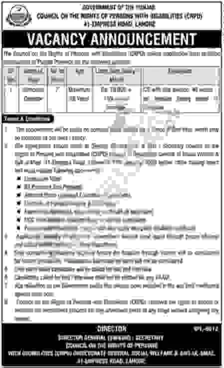 The Social Welfare and Bait-ul-Maal Department, Punjab has announced new government job opportunities for Punjab-domiciled candidates. Applications are invited for recruitment at the Council on the Rights of Persons with Disabilities (CRPD), Lahore.