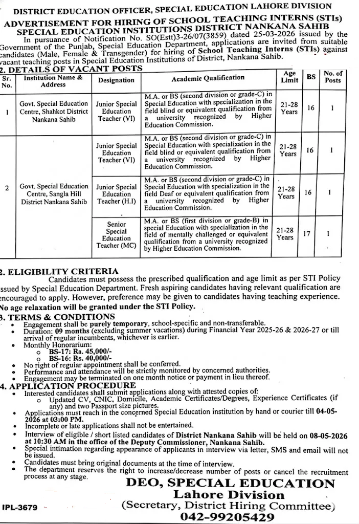 Special Education Department Punjab ne School Teaching Interns (STIs) ke liye latest vacancies announce ki hain. Yeh hiring District Nankana Sahib ke Special Education Institutions ke liye ki ja rahi hai.
