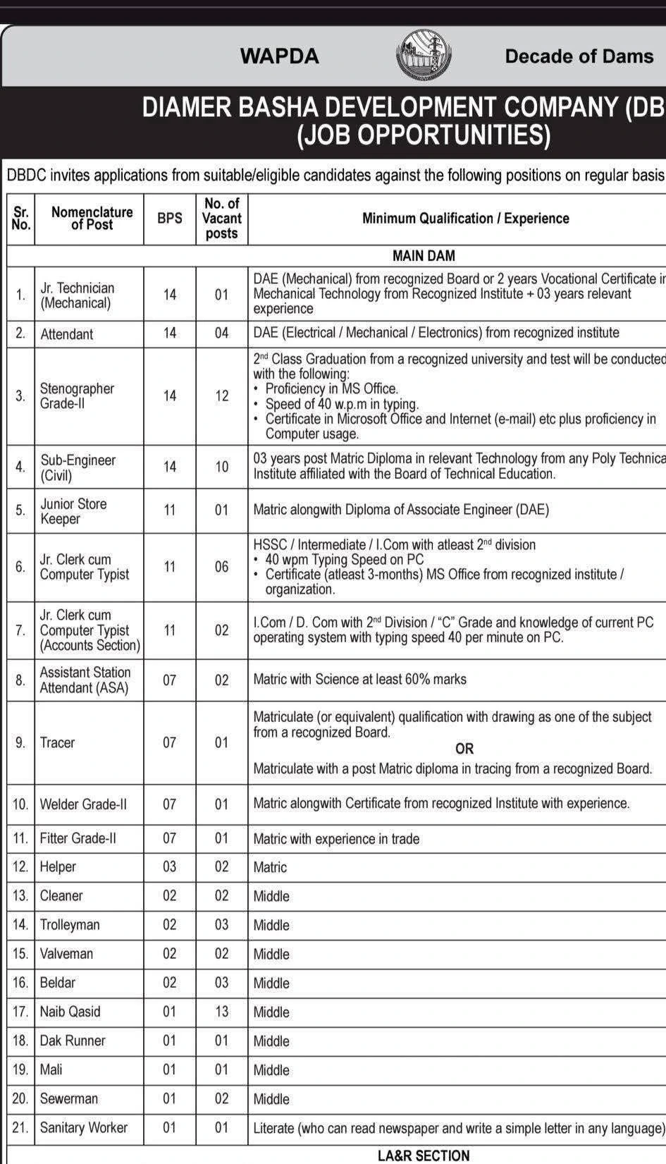 Pakistan’s Water and Power Development Authority (WAPDA) has announced multiple job opportunities under the Diamer Basha Development Company (DBDC) project, part of the “Decade of Dams” initiative. This recruitment drive is a golden chance for candidates from Tehsil Harban and other eligible regions to secure government jobs in various technical and non-technical categories.